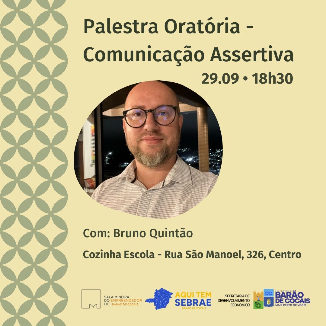 A Secretaria Municipal de Desenvolvimento Econômico, Sala Mineira do Empreendedor e Cozinha Escola Barão de Cocais convidam você para participar da Palestra: Oratória – Comunicação Assertiva.